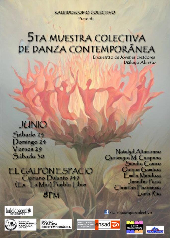 ¡Danza nuestra! Kaleidoscopio Colectivo presenta la V Muestra Colectiva de Danza Contemporánea en el Galpón Espacio de Pueblo Libre. Entre los bailarines participantes figuran Christian Plascencia, Lucia Rua, Qoriwayra Campana, Natalyd Altamirano, Sandra Castro, Quique Gamboa, Emilia Mendoza y Jennifer Parra. El citado evento tiene como principal objetivo reunir a los jóvenes creativos con quienes impulsara una mesa de diálogo abierta al público visitante. ¡No se la pierdan!