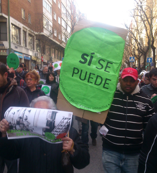 Lucía es dominicana y 'afrodescenciente', marcha de la mano con su hijo de ocho años. Lucía no sabe “exactamente” lo que es “la ETA”. Perdió su vivienda hace un mes y no falta a las convocatorias de la Plataforma de Afectados por la Hipoteca (PAH). Ahora vive con unas amigas a las que espera la misma situación que ha sufrido ella. “Nosotros no somos terroristas, somos activistas”, dice con una bonita sonrisa antes de que su hijo grite: “sí se puede, pero no quieren”.